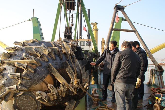 次日一早,戴總、崔主任不辭辛苦,親臨項目施工現場,登上挖泥船,就3800型挖泥船效率、排泥管跨越鐵路線問題進行分析,并提出有針對性解決措施,幫助、指導項目部解決施工難點。最后,戴總提出三點要求:一是鼓勵技術人員開動腦筋,用創(chuàng)新思維解決實際困難;二是項目公司要加強與當地政府的溝通,協(xié)調好拆遷補償及當前存在的突出問題;三是項目部要在確保安全的前提下,加快工程進度,早日完成工程量。